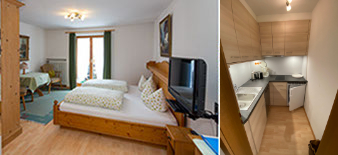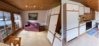 Ausstattung der Wohnung: Die Wohnung ist mit einem sep. Schlafzimmer, Wohnschlafraum, sep. Küche und DU/WC ausgestattet. Das Wohnzimmer ist großzügig, komfortabel und mit einer gemütlichen Essgruppe eingerichtet. Die Küche ist mit ausreichend Geschirr, einer Geschirrspülmaschine sowie Mikrowelle mit Backfunktion und Zubehör versehen. Die Wohnung hat zwei Ost- und einen Südbalkon, die bestuhlt sind. [Grundriss Wohnung Alpspitz]