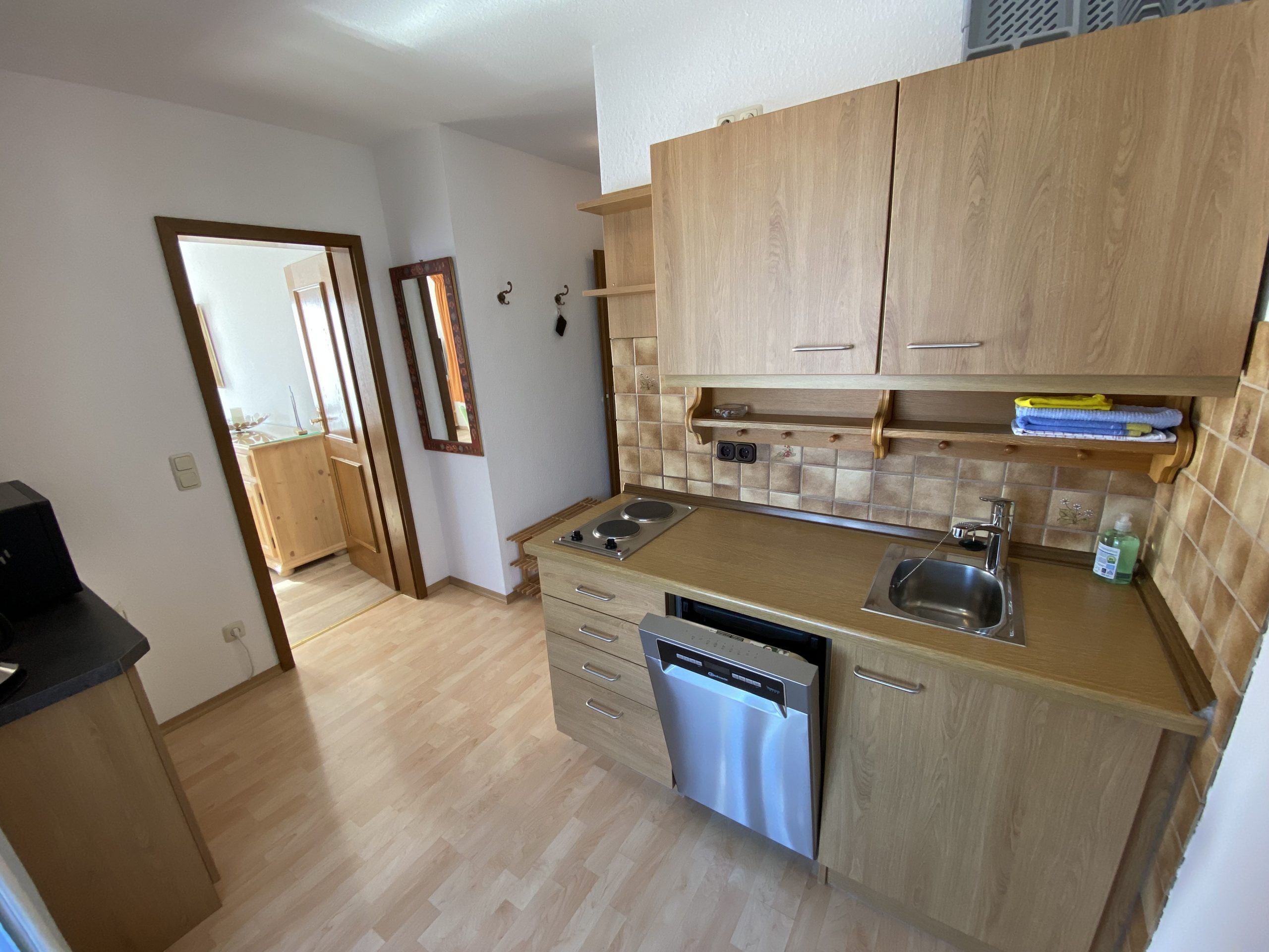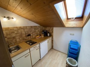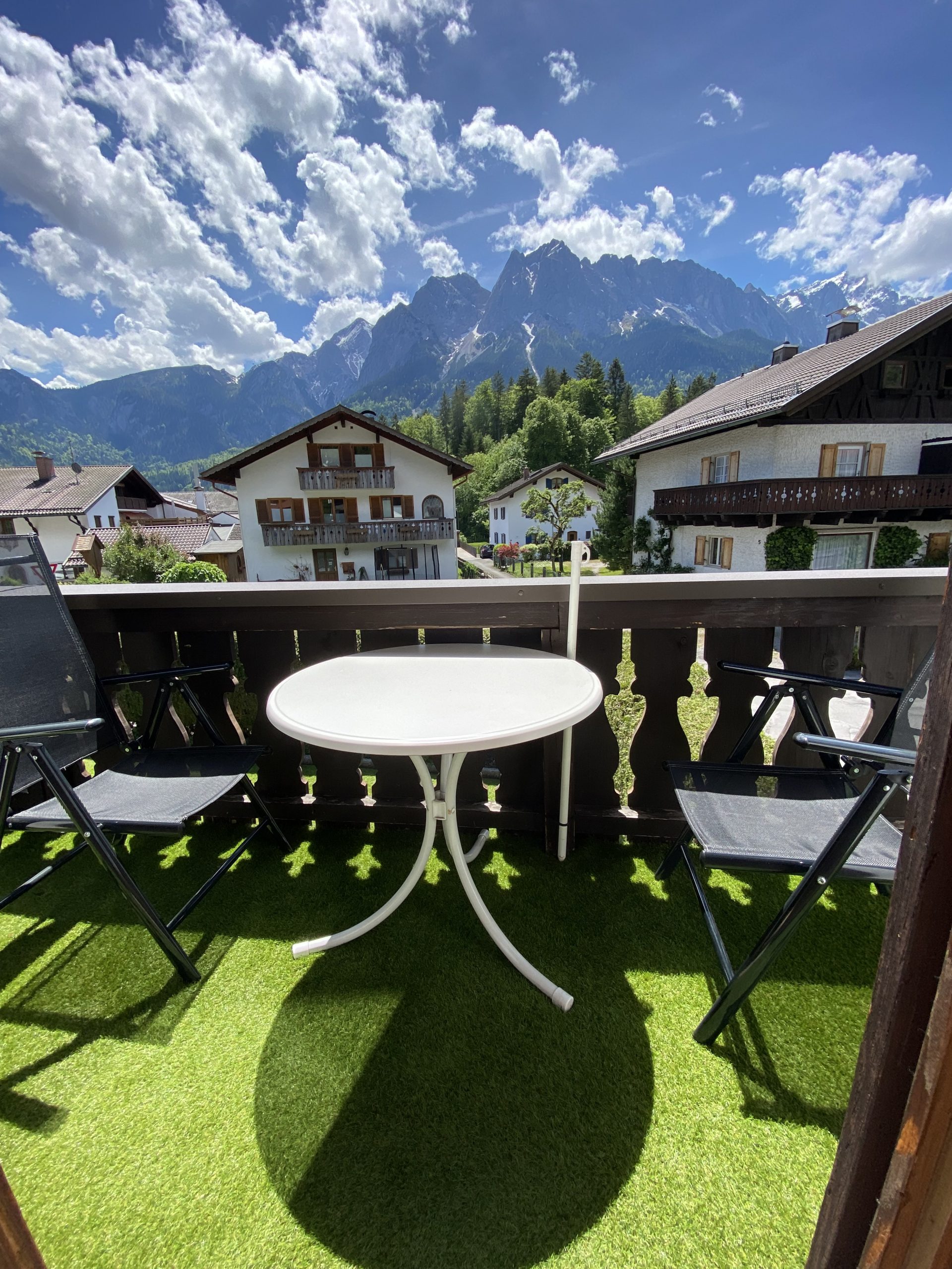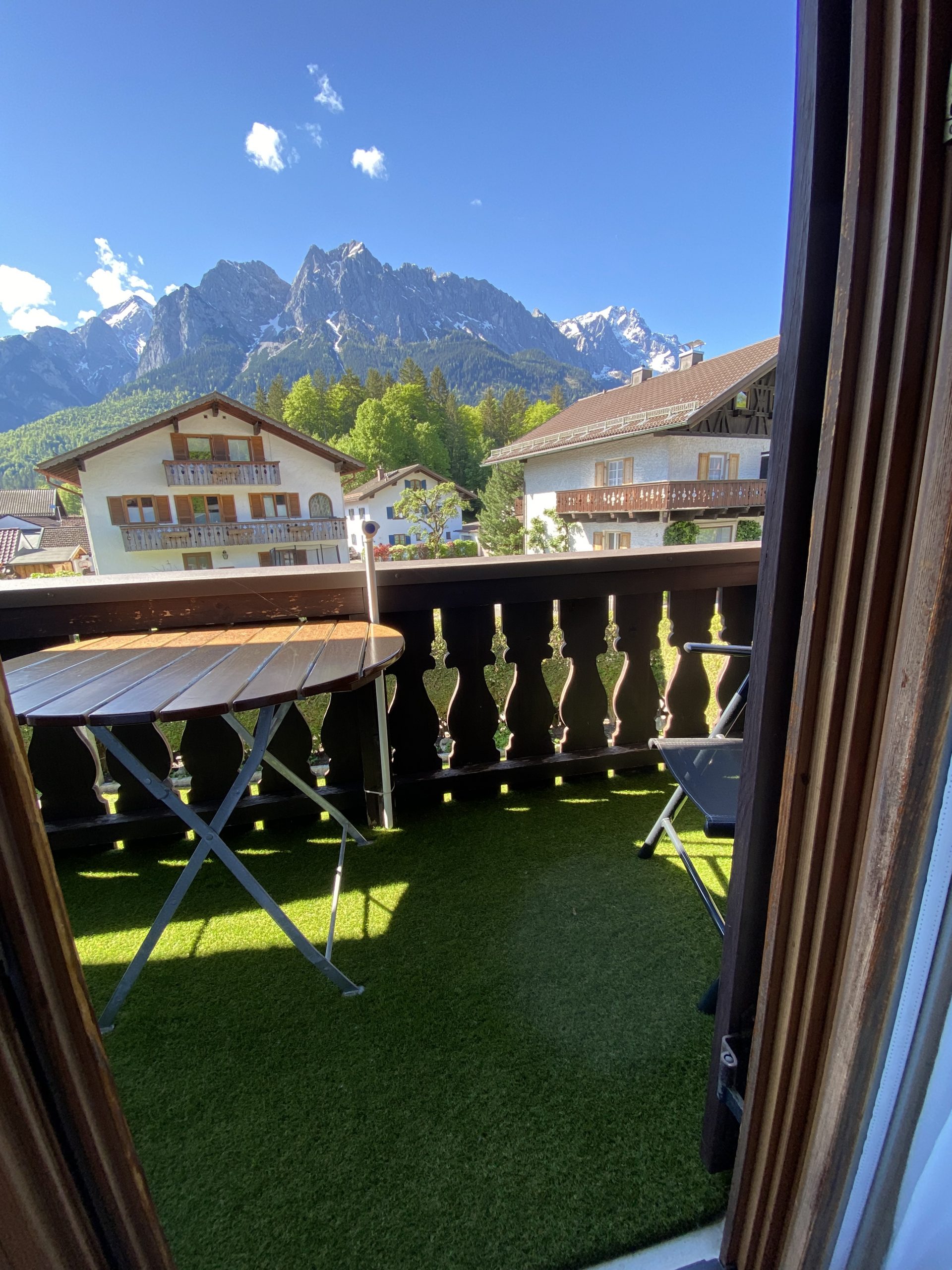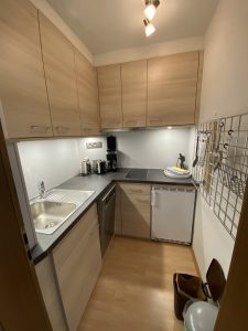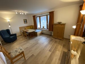 Ausstattung der Wohnung: Der Wohnschlafraum ist großzügig und mit einer gemütlichen Sitzecke ausgestattet. Die separate und hochwertige Küche ist mit einer Spülmaschine, ausreichend Geschirr und Zubehör eingerichtet. Die Wohnung verfügt über einen sehr schönen und bestuhlten Südbalkon mit Blick auf das Wettersteingebirge. DU/WC. [Grundriss Wohnung Waxenstein | Button rechts oben]