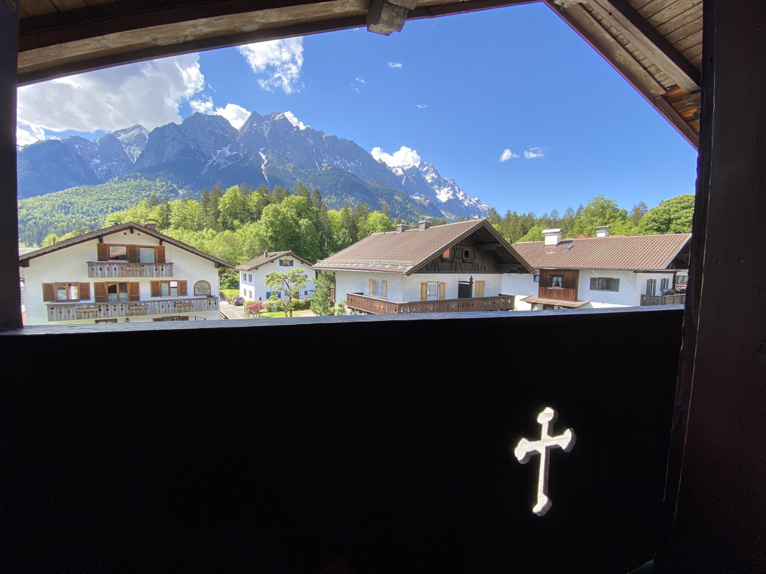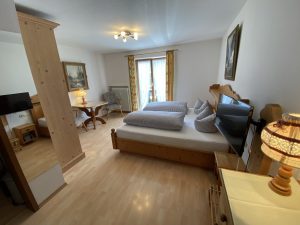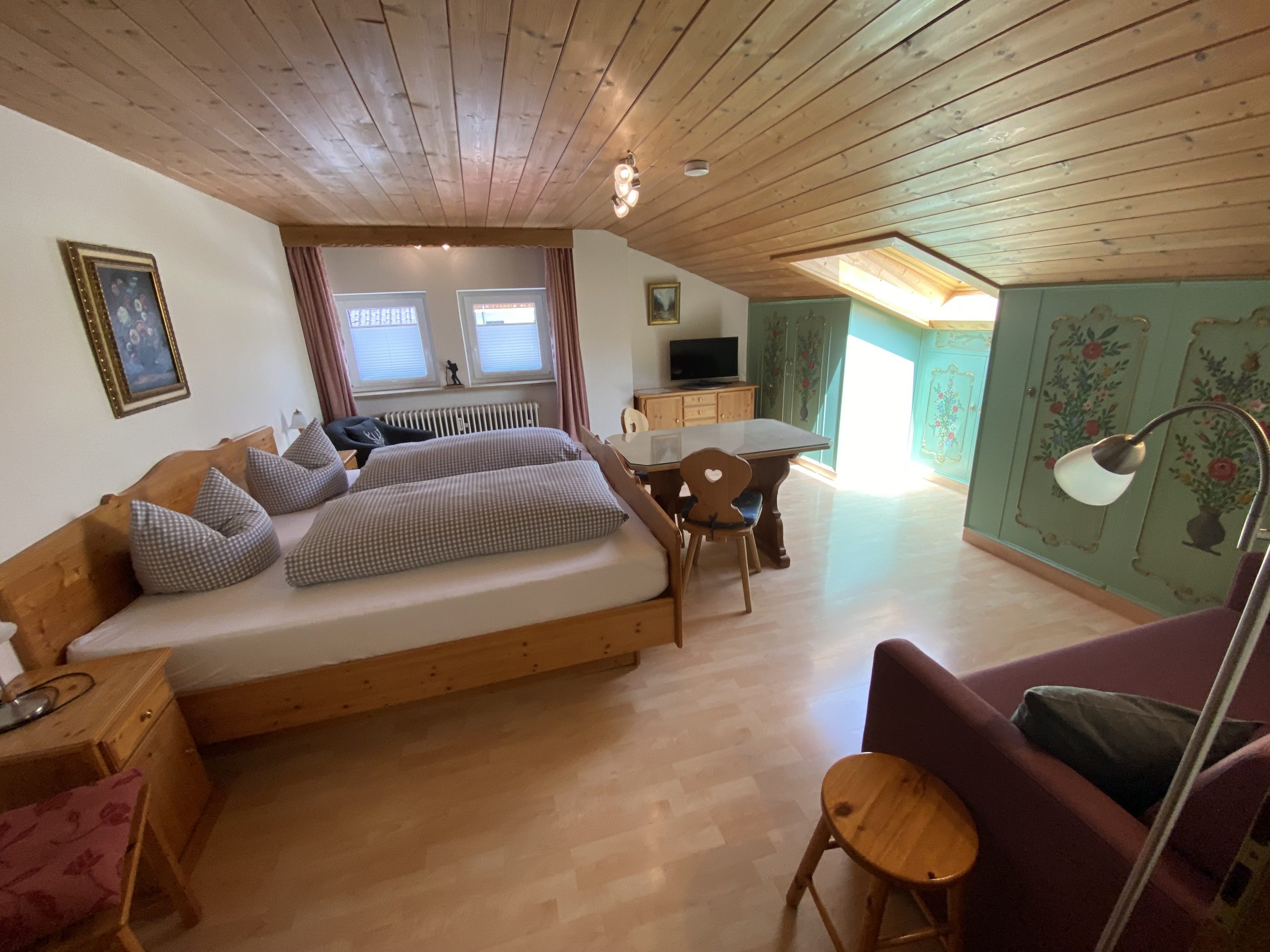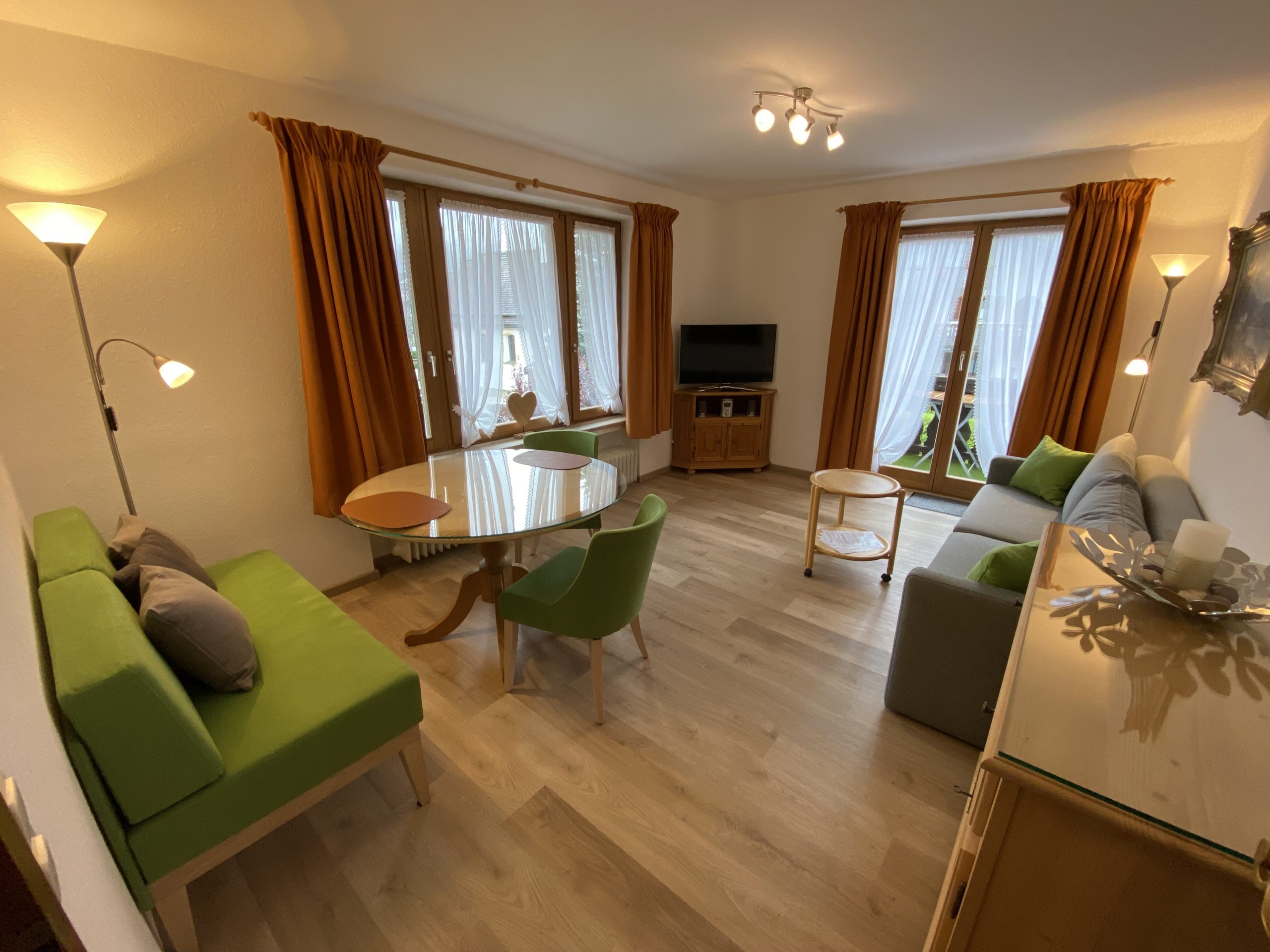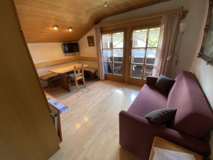 Ausstattung der Wohnung: Der Wohnschlafraum ist großzügig und mit einer gemütlichen Sitzecke ausgestattet. Die separate und hochwertige Küche ist mit einer Spülmaschine, ausreichend Geschirr und Zubehör eingerichtet. Die Wohnung verfügt über einen sehr schönen und bestuhlten Südbalkon mit Blick auf das Wettersteingebirge. DU/WC. [Grundriss Wohnung Waxenstein | Button rechts oben]