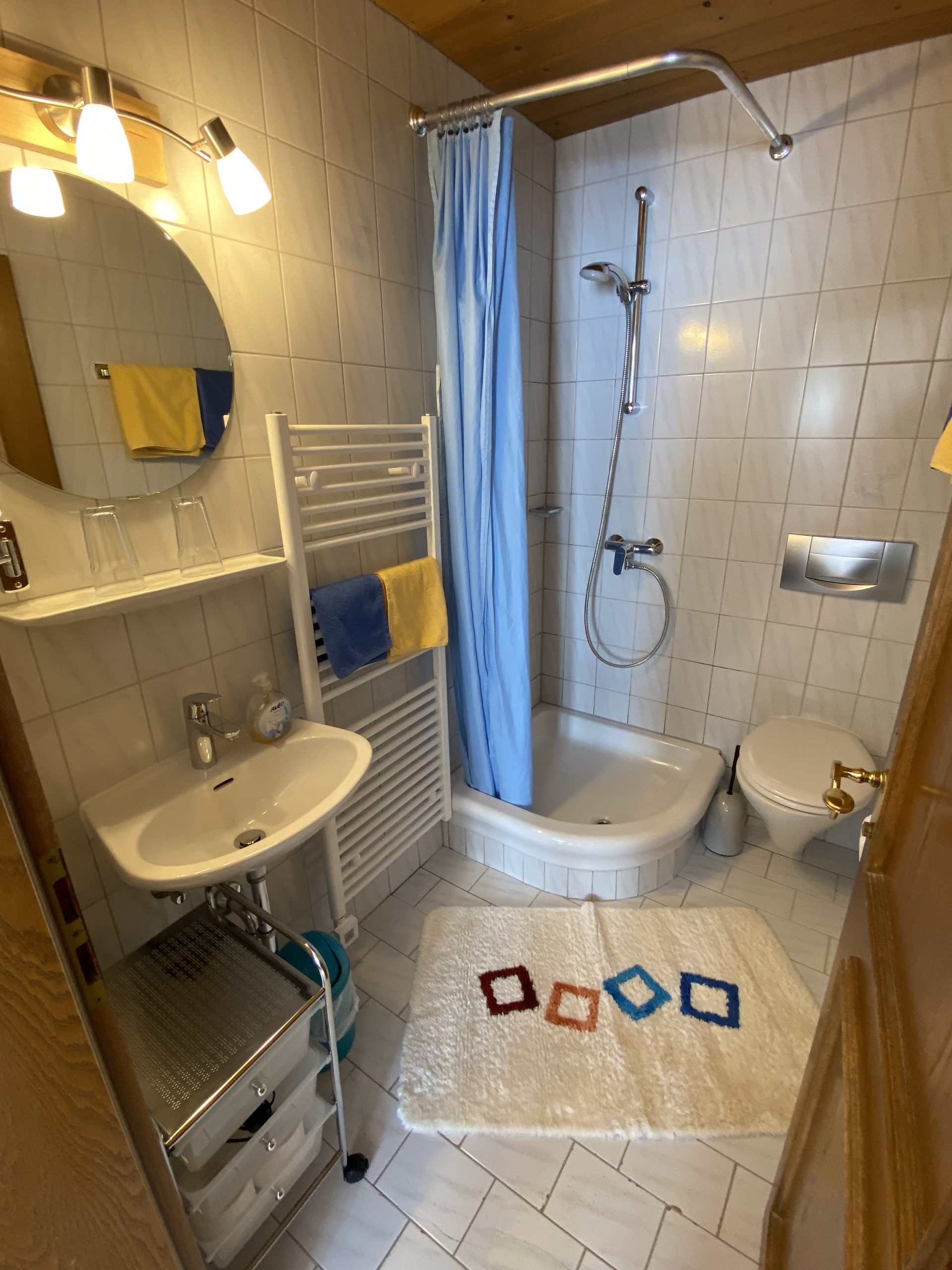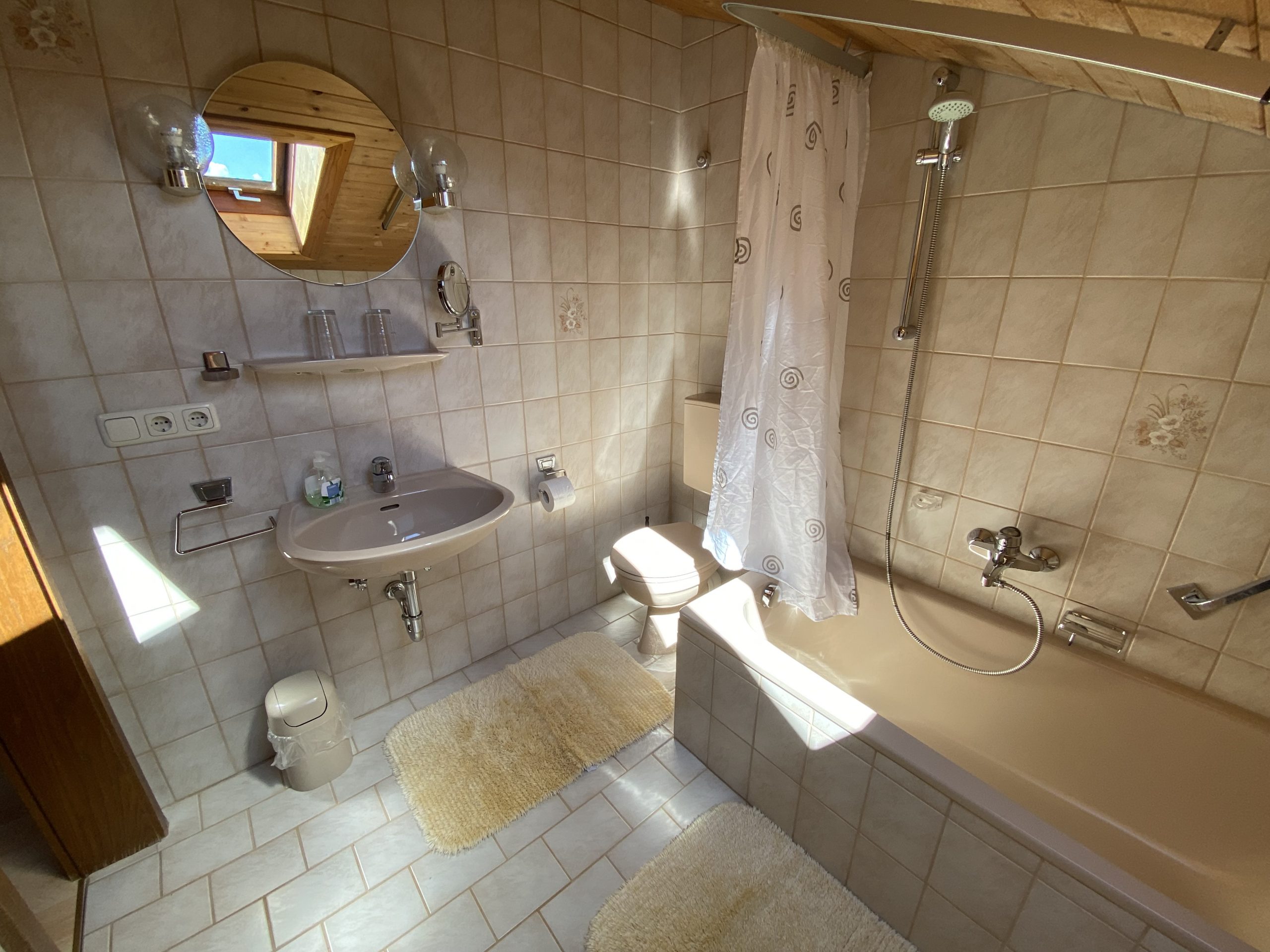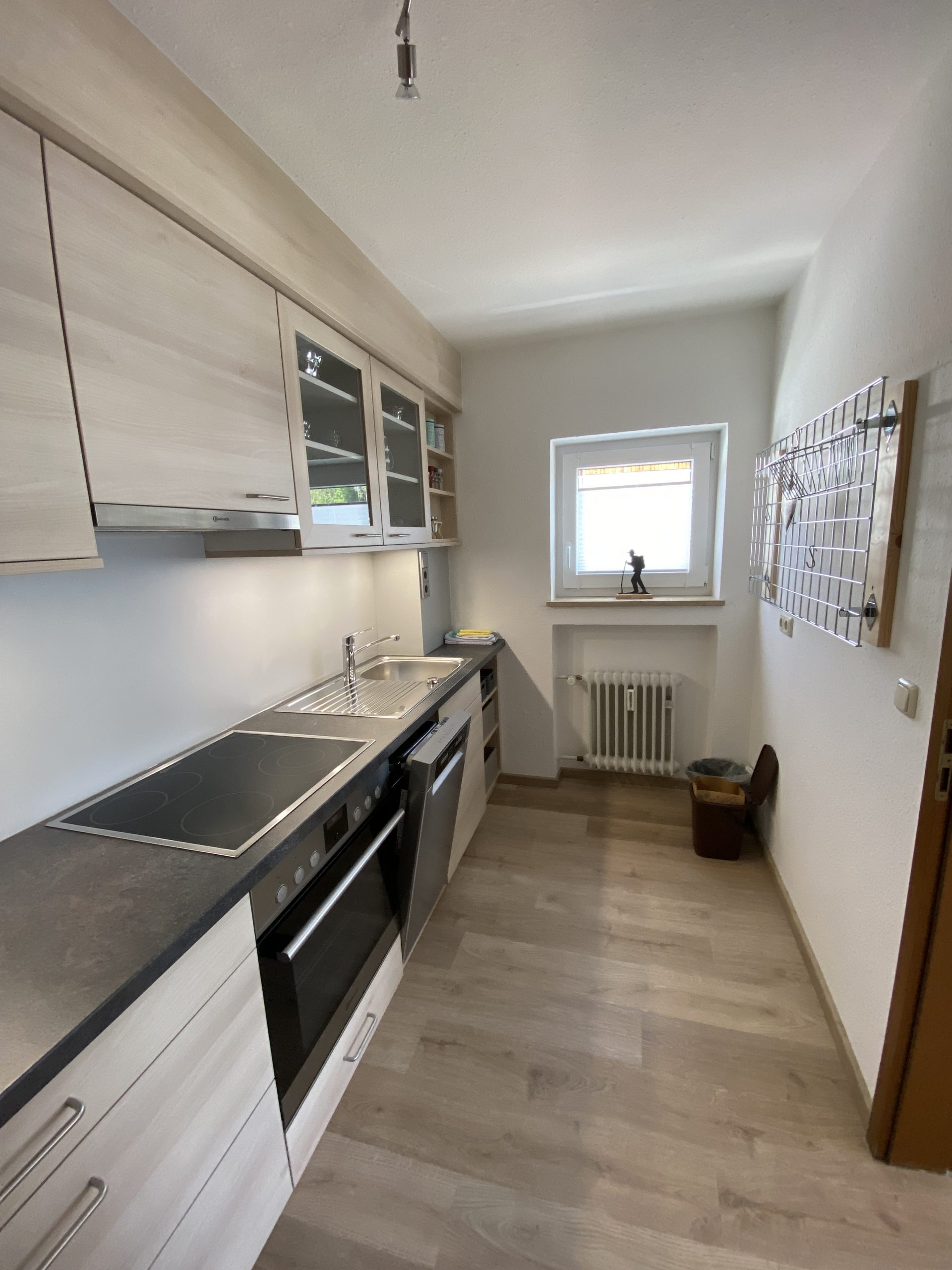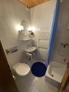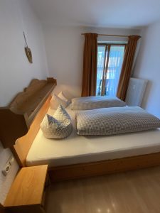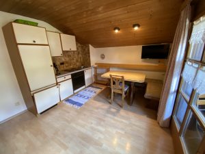 Ausstattung der Wohnung: Die Wohnung hat ein sep. Schlafzimmer, sep. Wannenbad mit Duscheinrichtung/WC. Die großzügige Wohnküche hat einen Herd mit Backofen, Geschirrspüler und eine zusätzliche Schlafcouch. Die Küche ist mit ausreichend Geschirr und einer gemütlichen Sitzecke versehen. Die Wohnung hat einen kleinen begehbaren Südbalkon. [Grundriss Wohnung Zugspitz, Button rechts]