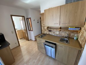 Ausstattung der Wohnung: Die Wohnung ist mit einem sep. Schlafzimmer, Wohnschlafraum, sep. hochwertiger Küche mit Geschirrspüler, sep. großzügigem Bad mit barrierefreier Dusche und WC ausgestattet. Die gut eingerichtete Küche ist mit ausreichend Geschirr versehen. Der Wohnschlafraum ist großzügig und komfortabel eingerichtet. Die Wohnung hat einen angenehmen und platzbietenden Ostbalkon. [Grundriss Wohnung Kreuzeck, Button rechts]